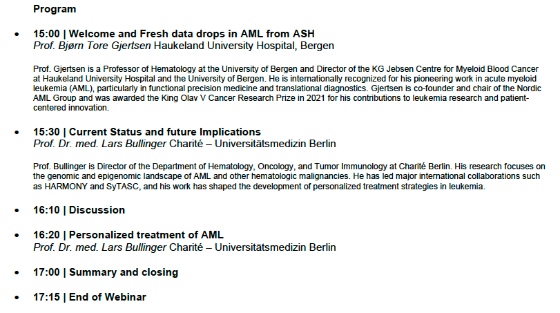 You are invited to join a distinguished academic webinar featuring Prof. Dr. med. Lars Bullinger and Prof. Bjørn Tore Gjertsen, two leading experts in hematology and leukemia research. The webinar is hosted by Jazz Pharmaceuticals